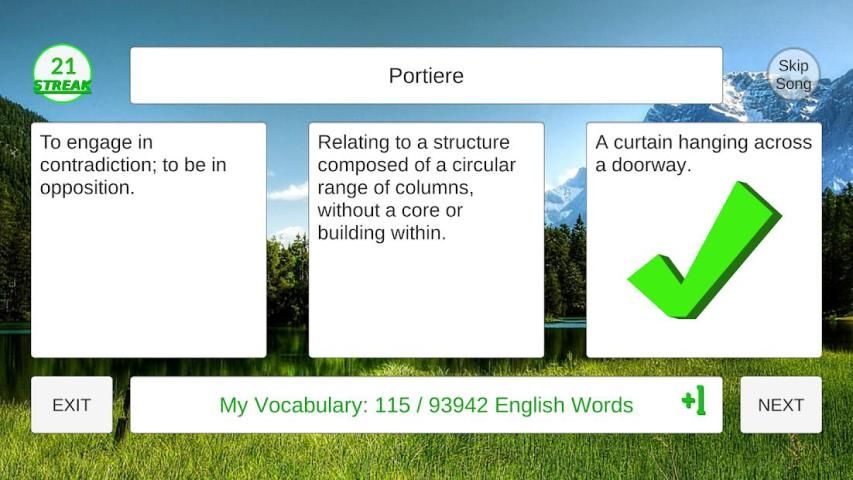 Build your vocabulary, and master every word in our "English Classic Edition" dictionary to become a true sesquipedalian! Carefully curated, relaxing images and sounds accompany pleasant game play as you discover new and fun words, or rediscover meaning behind words you use every day. Take advantage of our options to tailor the experience to your mood and preferences. Test your vocabulary skills against players all over the world, or against your friends with our global and social leader boards. Enjoy a 100 word daily challenge. Review your answers to cement your newfound knowledge. Expand your vocabulary and have fun doing it!