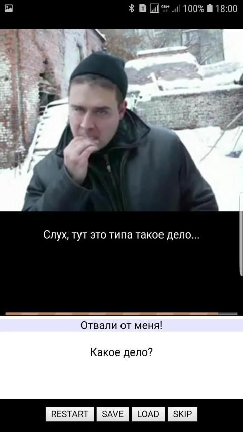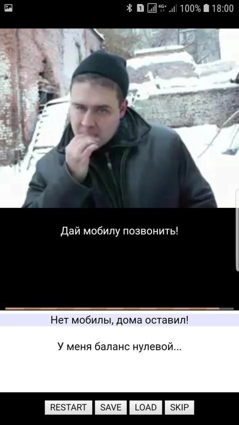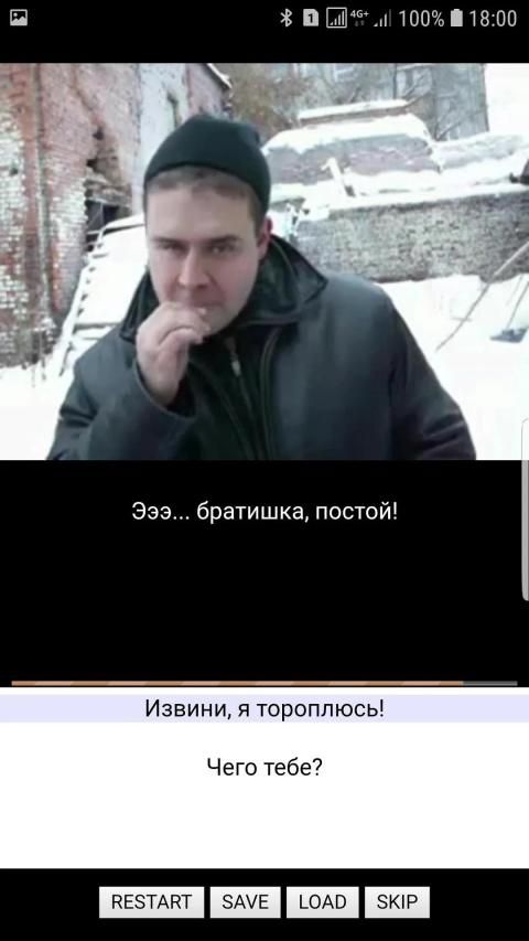 К вам подваливает гопарь и начинает трясти деньги. Отвечая на вопросы гопа, надо стрясти деньги с него самого. Всего в игре 10 различных финалов, один из них самый главный.