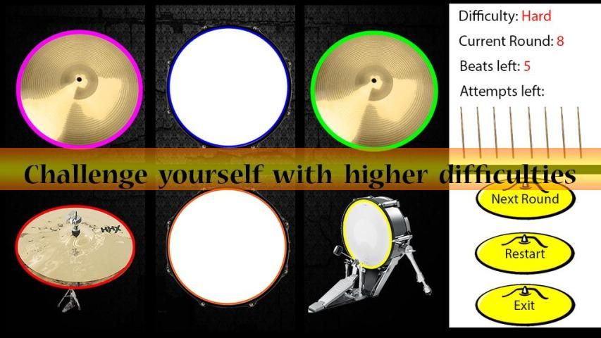 Tantang diri Anda dengan kesulitan yang lebih tinggi. Jika Anda dapat menangani modus mudah, seberapa jauh Anda bisa mendapatkan dalam kesulitan yang lebih tinggi? Lebih drum ditambahkan ke kit kesulitan yang lebih tinggi yang Anda pilih. Dapat memori Anda menangani ketukan rumit?