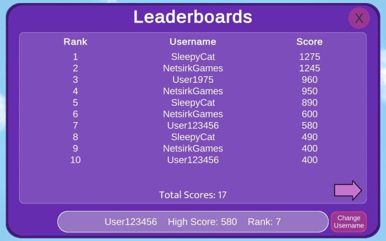 -Leaderboards: Create a username and aim for the highest score! Upload up to 10 scores on the leaderboards and compete with others for the best score
