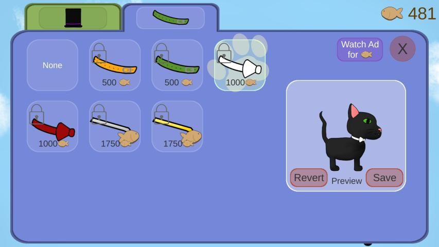 -Customization: Use fish treats to unlock hats and collars for your cat to wear!