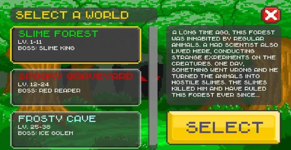The player ventures and battles monsters in worlds with various themes, including ice monsters, fire monsters, green monsters, etc. Fight your way through increasingly challenging enemies to unlock new stages and bosses. Hit high scores and collect stars to complete the level. The monsters can drop items that can improve your player's strength. You can sell the items in the shop for gold or you can make them even more powerful by enchanting them. There are currently 100+ items dropped by monsters and sold in the shop.