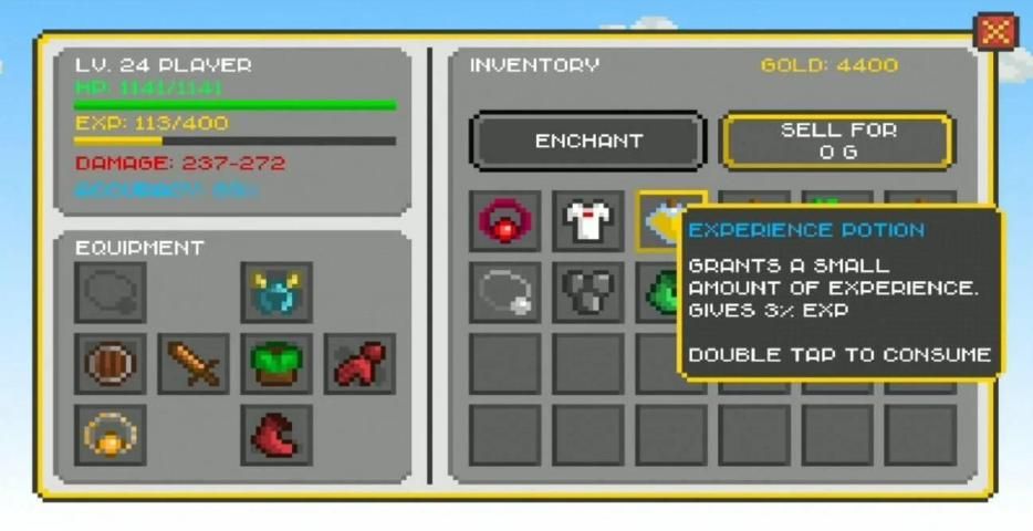 Anda meningkatkan level pemain dengan mendapatkan pengalaman dari mengalahkan monster tetapi Anda juga dapat membeli item khusus untuk meningkatkan XP. Saat permainan berlangsung, monster akan menjadi lebih kuat.