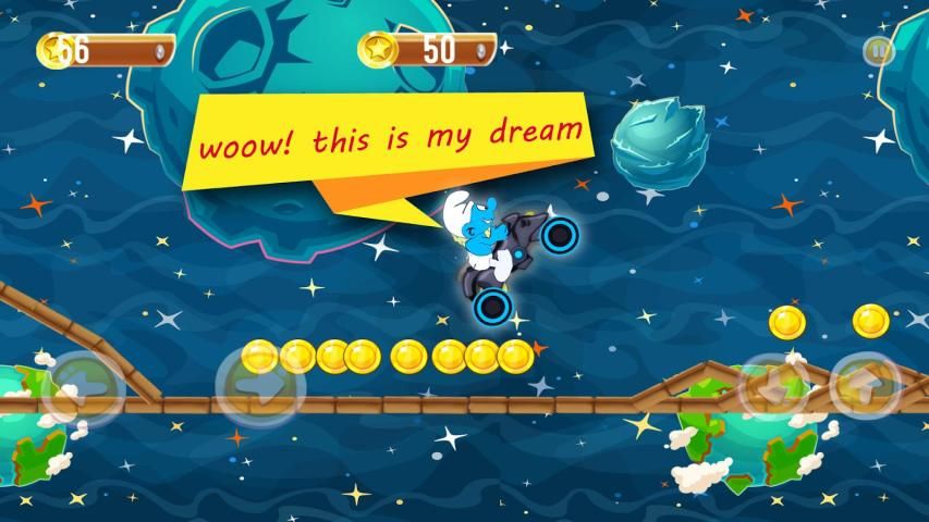 Biarkan sepeda motor Anda dalam ruang mimpi Smurf patung dengan kecepatan tinggi untuk menikmati mimpinya. Berbagai musik menarik untuk terburu-buru dan keterampilan dalam skuter Anda. Run tak berujung di negara lain: untuk melarikan diri bawah tanah untuk menghindari kereta mendekat, melarikan diri Smurfs, taksi dan bus di jalan kota untuk berselancar adegan malam yang indah secepat Anda bisa!
