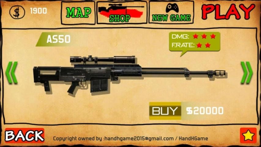 kamu akan bermain penembak jitu, dan membunuh semua teroris peta bisa mendapatkan kemenangan. Permainan memiliki banyak senjata untuk memilih: Deagle, M4A1, AWP, AW50, AS50, Bom, Kit Medis. Deagle, M4A1, AWP, AW50, AS50, Bom, Kit Medis. Membunuh musuh bisa mendapatkan penghargaan emas, emas dapat digunakan untuk membeli senjata dan amunisi. Membiarkan kamu mengalami perasaan senjata yang berbeda. Ini adalah perang sniper nyata!