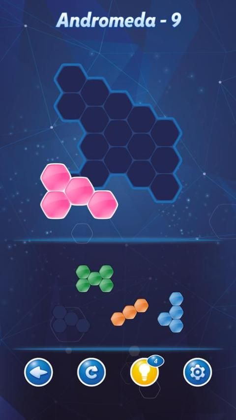 Memindahkan blok hexa untuk mengisi panel, untuk memenangkan tingkat dan untuk menaklukkan rasi bintang.