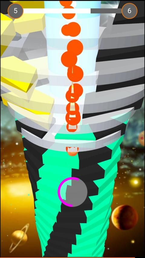 Press and hold on the screen and let the ball drop down without touching the obstacles! Hold as long as possible to make booster and break the black blocks. Let the ball fall drop down from the helix stacks.