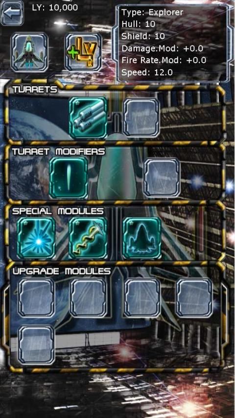 # Equipped turrets and turret modifiers can be switched any time during a mission. Equipped special modules can be used as active skills once within their cooldown interval. Equipped upgrades are passively modify your ship properties.