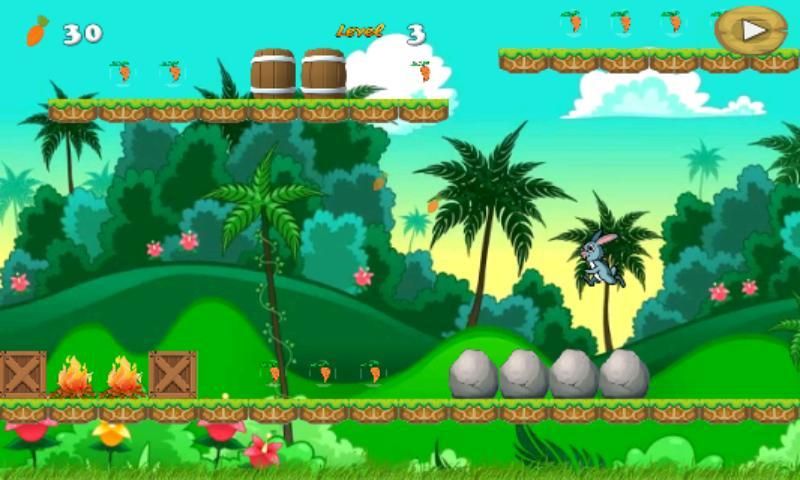 Super Bunny Run!!! A simple and addictive adventurous platformer game with simple and easy controls. Help the running bunny survive and escape from the jungles by running and jumping over over the obstacles, and collecting as many carrots as possible. The game is quite easy to play. This Easter super bunny run game is one of the best adventure game on the market. It features HD graphics with great music. And most importantly, it has 5 worlds, each with different graphics and new adventure levels.