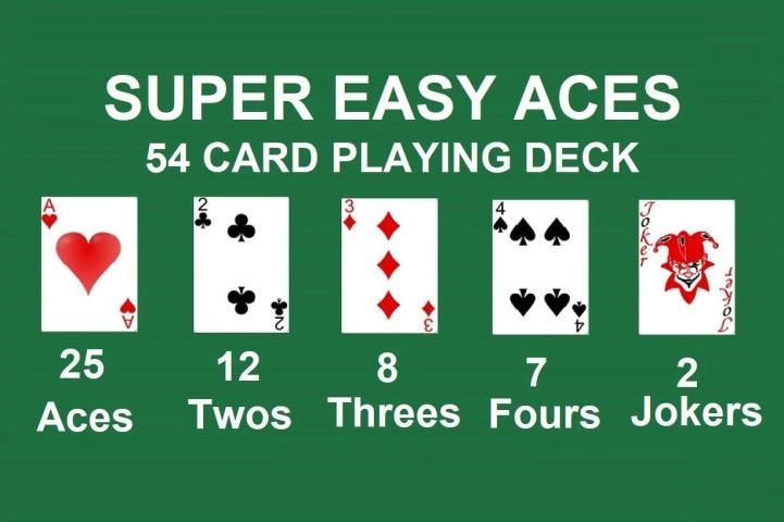 Untuk memulai, Super Easy Aces menggunakan setumpuk kartu remi yang benar-benar dibayangkan. Dalam permainan kami, kami menggunakan setumpuk kartu 54 yang terdiri dari 25 ace, 12 dua, 8 bertiga, 7 merangkak dan 2 pelawak.