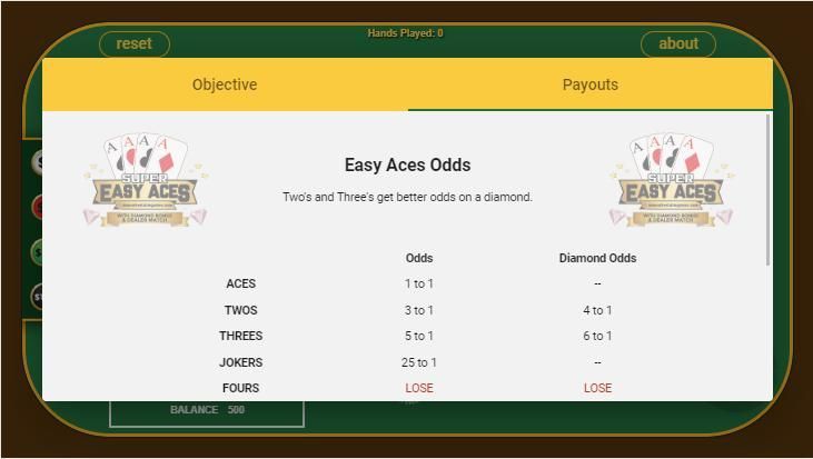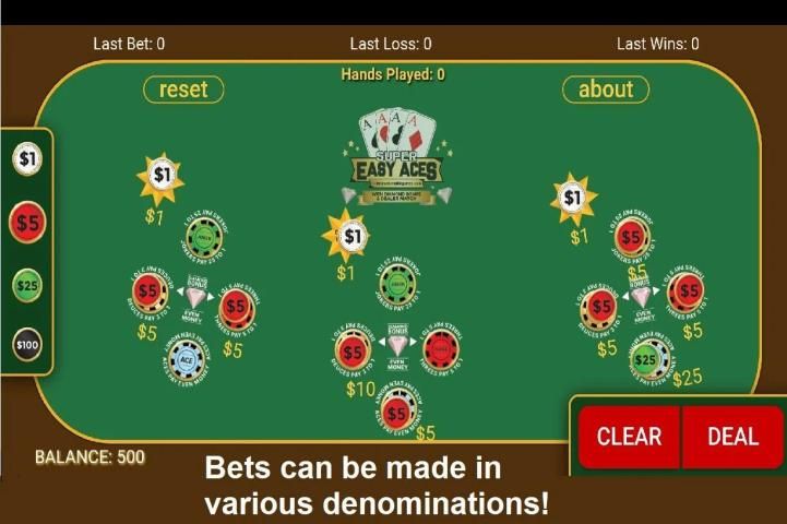 Super Easy Aces diciptakan oleh dealer kasino dengan lebih dari 40 tahun dalam bisnis ini. LAUT. dikembangkan untuk permainan kasino langsung dan disertifikasi oleh Gaming Laboratories International untuk beberapa yurisdiksi game termasuk negara bagian Nevada.