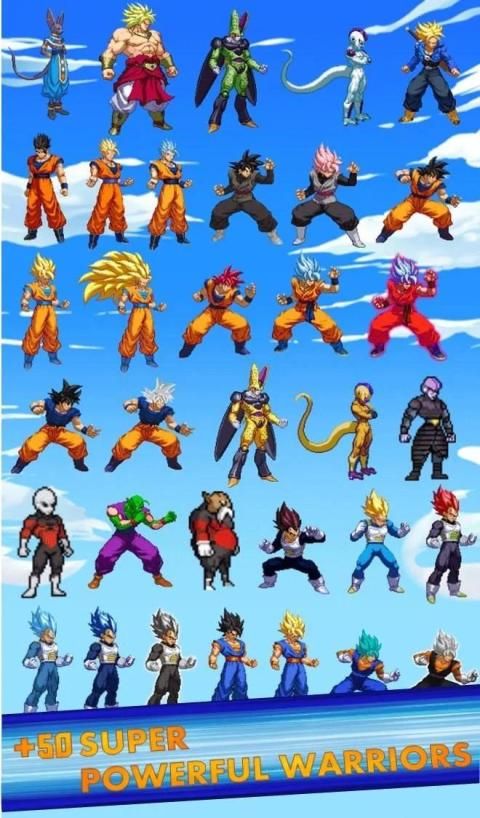 There are more than 60 super powerful warriors with their Super Saiyan transformations such as: Goku (with all its transformations till Ultra Instinct), Vegeta (all transformations including Beyond Super Saiyan Blue, and additional transformations like Super Saiyan God and Ultra Instinct), Vegito (+ Super Saiyan 2, Super Saiyan God, Super Saiyan Blue, and Ultra Instinct), Beerus, Broly, Cell (+ Golden Cell), Frieza (+ Golden Frieza), Future Trunks, Goku Black (+ Black Rose), Gohan (+ SSJ 2, SSJ Blue), Hit, Jiren, Piccolo, Toppo, … and more Dragon Z super heroes are coming soon.