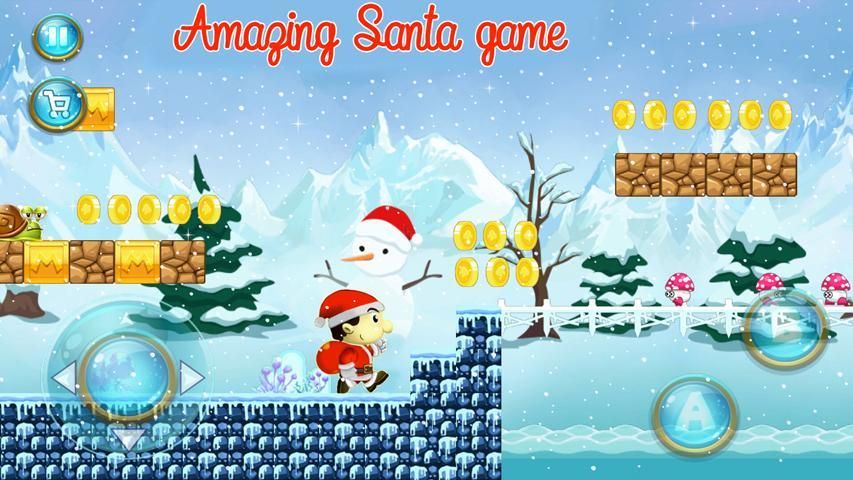 Membantu santa kami untuk melompat semua hambatan mengumpulkan semua hadiah, koin dan menghindari leprechaun finis di semua tingkatan. Gunakan gamepad virtual yang adalah kontroler keren untuk mengontrol dia. Mengumpulkan semua hadiah untuk anak-anak Natal. Mengumpulkan koin sebanyak mungkin untuk membeli barang-barang bertuah seperti jamur atau salju bola.