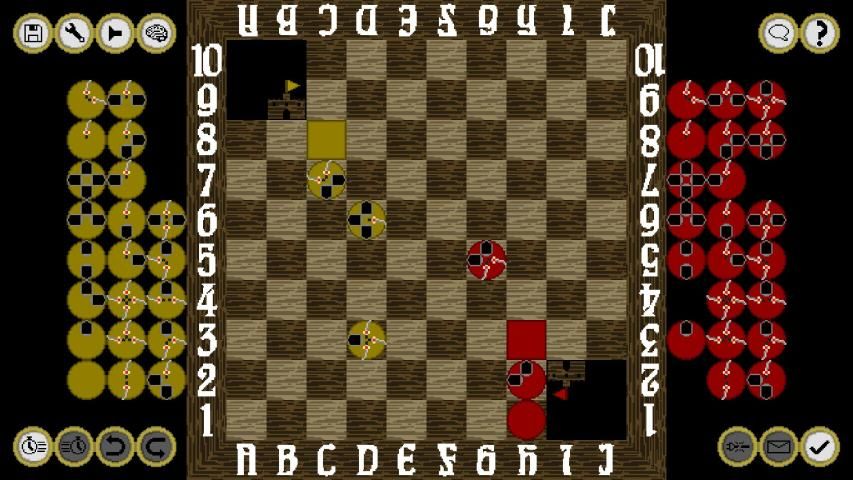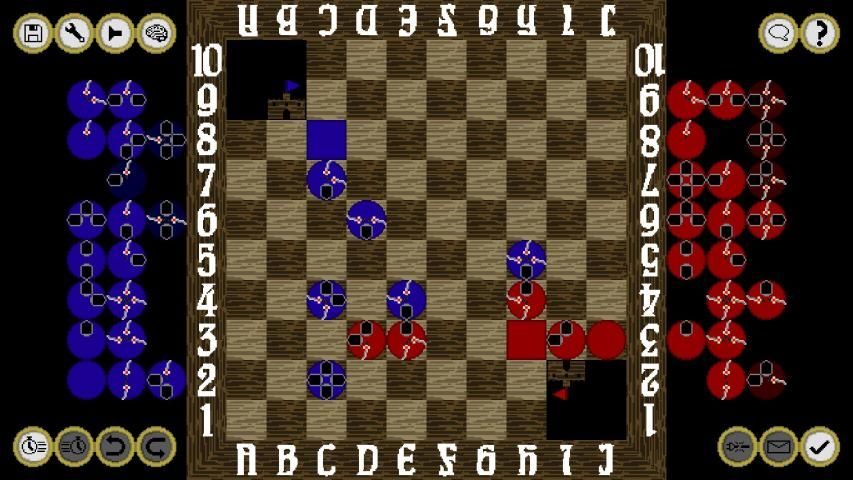 Each player owns 24 game pieces that have 4 slots in each direction that are armed with either a sword, a shield or nothing at all. When a sword faces another piece a reaction happens: