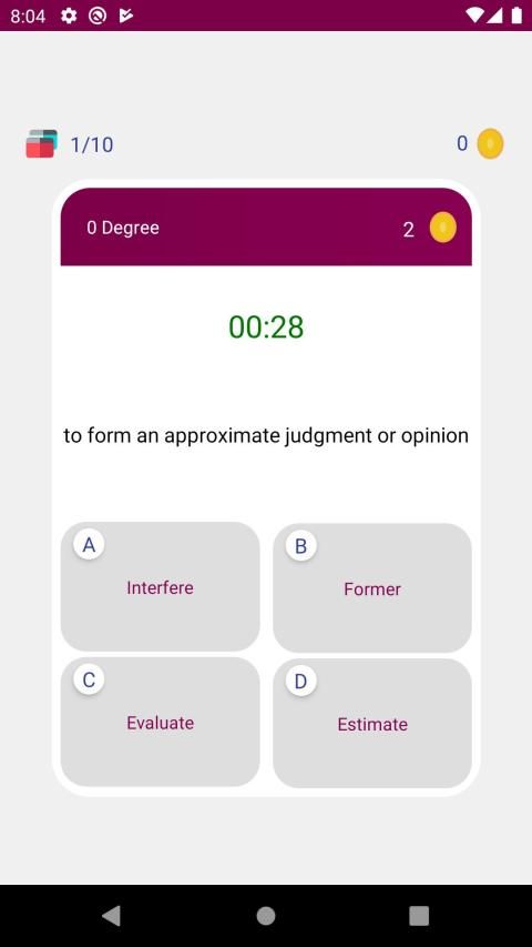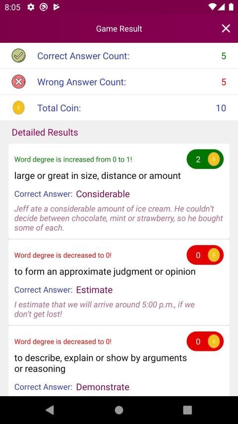 Anda dapat menjawab kata yang sama sekali dalam sehari, aplikasi tidak akan bertanya lagi kepada Anda. Ketika Anda memberikan jawaban yang benar, tingkat pengetahuan Anda meningkat dan untuk jawaban yang salah tingkat pengetahuan Anda berkurang. Jika tingkat pengetahuan kata mencapai 4, kata itu akan ditambahkan ke daftar kata yang dihafal dan tidak akan ditanyakan lagi.