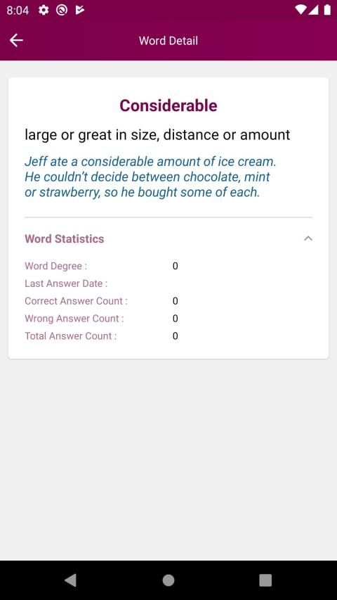 - Statistics information showing how many times you answered correctly for each word, how many times you answered incorrectly, when did you answered that word.