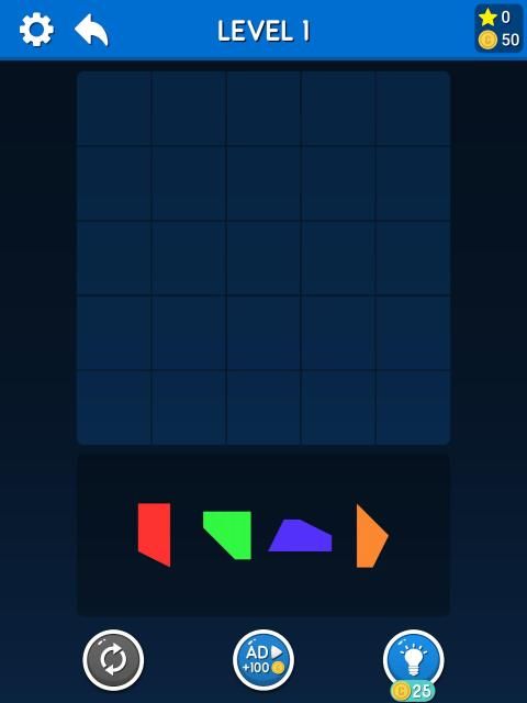 Seret bentuk di atas papan untuk menempatkannya, bentuk tidak dapat ditempatkan di atas bentuk lainnya.