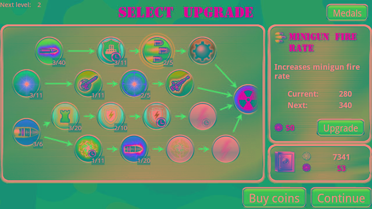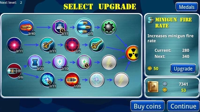 Menghabiskan koin antara misi untuk meng-upgrade senjata dan perlindungan dasar, dan untuk meningkatkan senjata khusus juga!