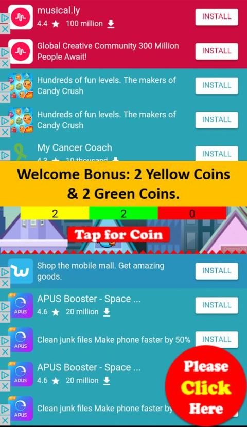 • Perlu koin merah lebih rendah dari koin kuning dan hijau. Jika tidak, Anda tidak akan melihat iklan. Jika hal itu terjadi, jangan khawatir, hanya terus tekan, Anda akan melihat iklan lagi ketika merah lebih rendah daripada kuning.