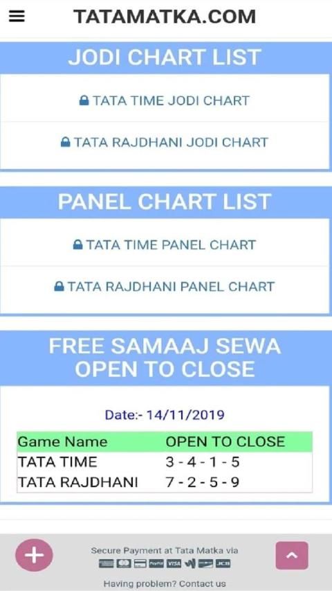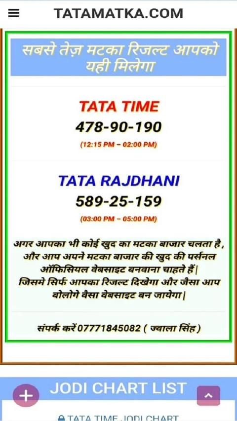 We are Official tata time and tata rajdhani bazar website here you can get fast tez matka result of tata bazar only download it. welcome you to our official tata matka website which is the only place on the internet where you can find the genuine website here you can get Daily free tips and tricks to win at the Tata Matka. Worlds No 1 matka website for today's all live tata time and tata rajdhani matkaresult, jodi charts, panel records, online game, lucky number. So we advise you to play safely and steadily. If you bet less amount and you lost then you’d have some change that you can bet on the next time. - TATA MATKA TEAM.