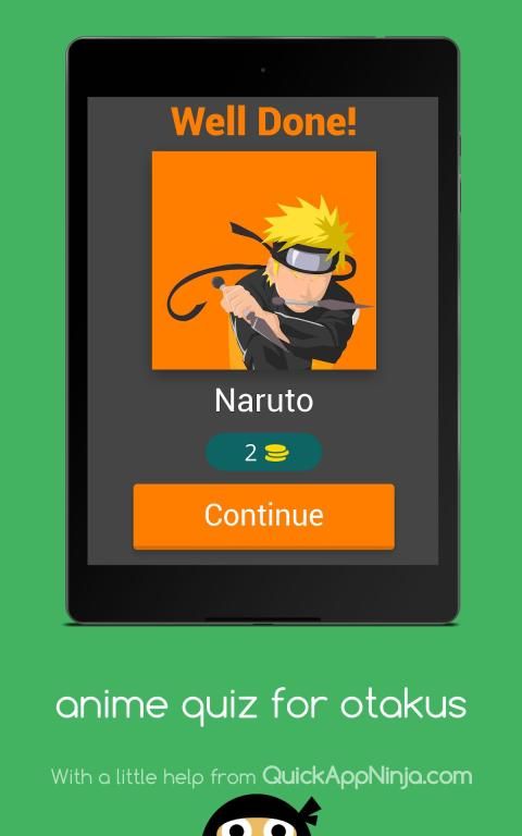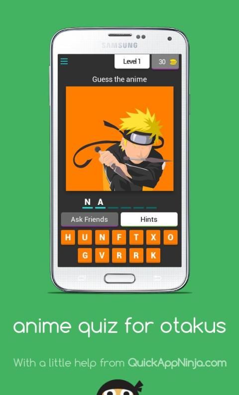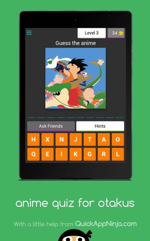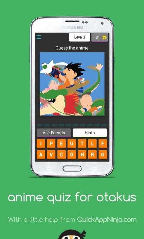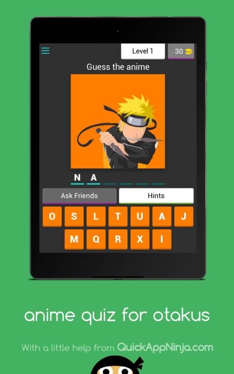 Anda akan ditampilkan seni minimal anime dan Anda harus menebak nama anime. Anda dapat menggunakan koin untuk menunjukkan surat kepada Anda atau untuk melewati level. Anda bisa mendapatkan koin dengan memposting tentang game di jejaring sosial Anda.