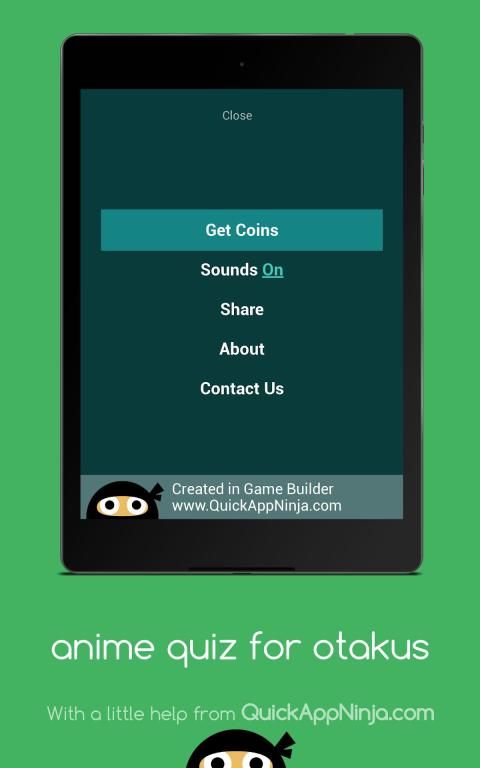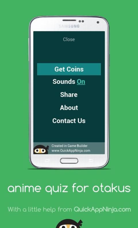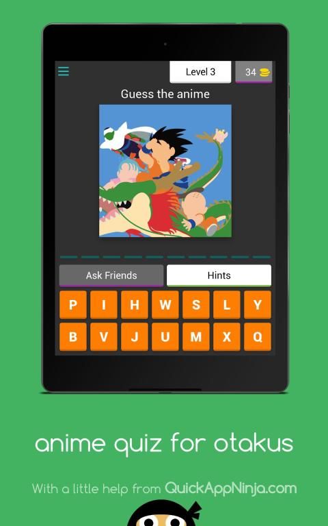 You will shown a minimal art of an anime and you have to guess the anime name. You can use coins to show you letters or to skip the level. You can get coins by posting about the game in your social networks.
