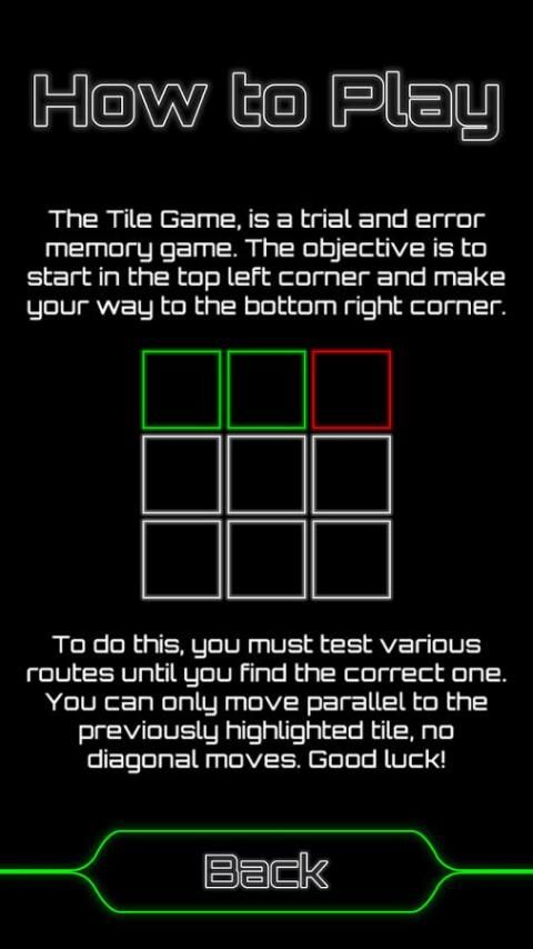 The Tile Game, adalah trial and error permainan memori. Tujuannya adalah untuk memulai di sudut kiri atas dan membuat jalan ke sudut kanan bawah.