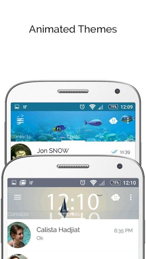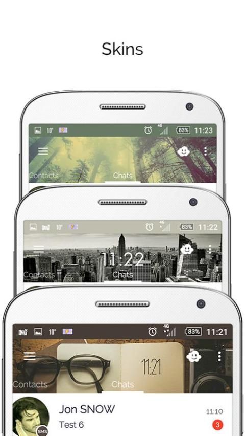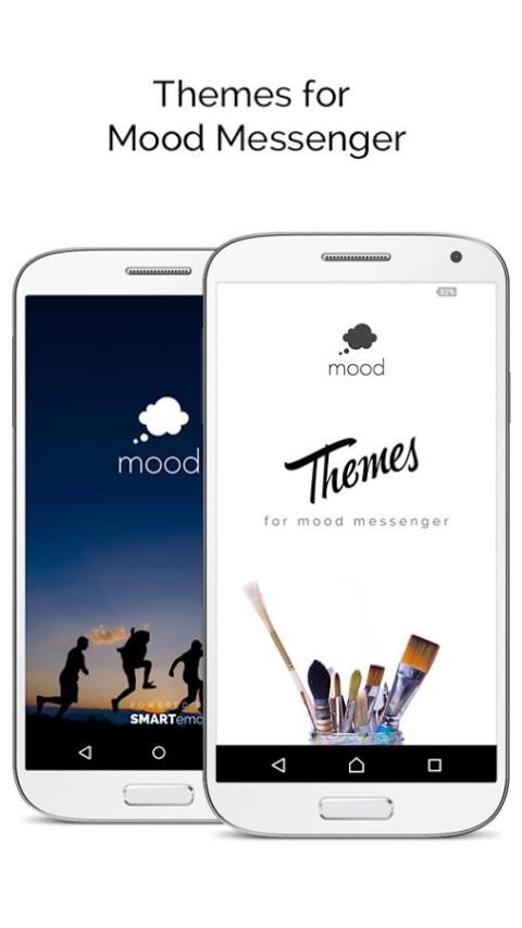 THEMES mengizinkanmu untuk memilih dan menerapkan tema ke SMS & MMS Mood Messenger hanya dengan sentuhan pada tombol!