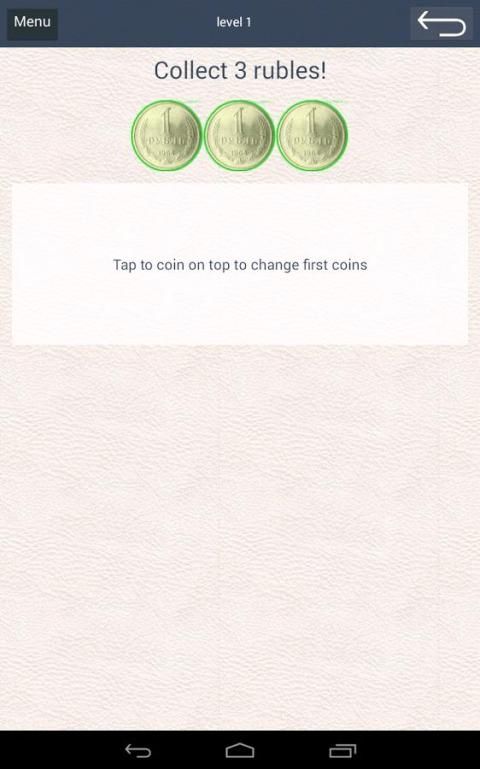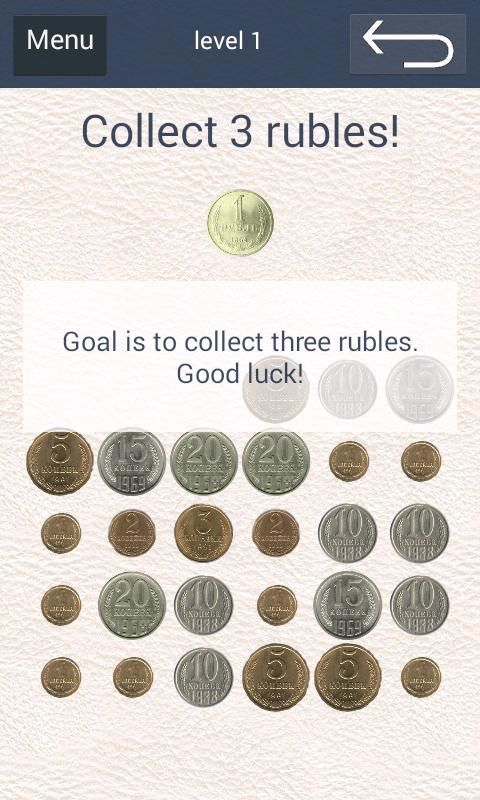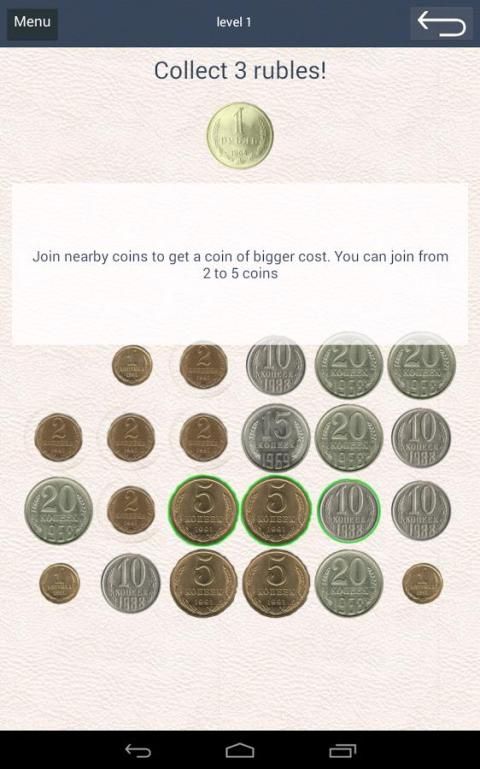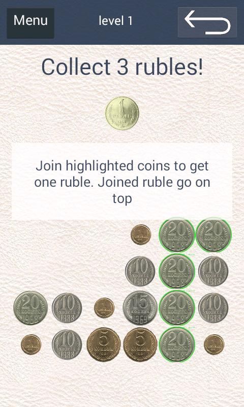Tujuannya adalah untuk mengumpulkan tiga koin rubel dengan menghubungkan koin dan mendapatkan koin nominal lebih besar.