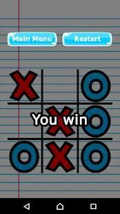 Tic-tac-toe (juga dikenal sebagai Noughts dan salib atau Xs dan Os) adalah permainan kertas dan pensil untuk dua pemain, X dan O, yang bergiliran menandai ruang dalam 3 × 3 kotak. Pemain yang berhasil menempatkan tiga tanda mereka dalam baris horisontal, vertikal, atau diagonal memenangkan permainan. Pada versi ini Anda bisa bermain melawan orang lain atau melawan komputer
