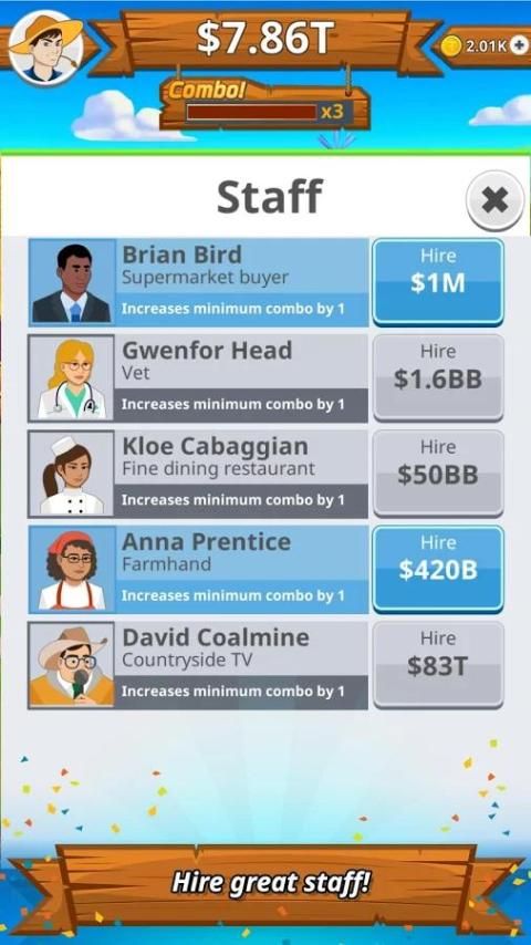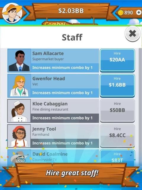 Perlu bantuan untuk memperluas kerajaan pertanian Anda? Mempekerjakan staf yang fantastis. Dari buruh tani untuk pembeli supermarket, mereka akan mengirim laba naik, naik, naik.