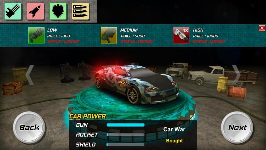 * Four different environments: day, snowy, rainy and city night with four playable cars.