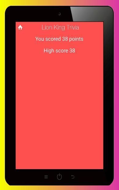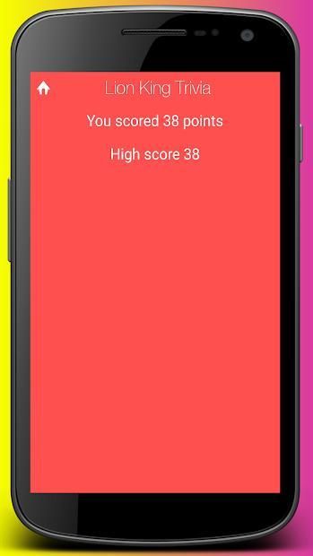 Trivia for The Lion King, the American computer-animated adventure musical film, is a free, fun and addictive android quiz game developed by Victory Quizzes. The game contains well over 100+ questions which are meant to test your knowledge about the famous computer-animated musical film. Be in the center of the spotlight by reaching the first place in our ranking system so that everyone can see your name! Do you have what it takes to complete in time all the questions correctly?