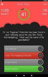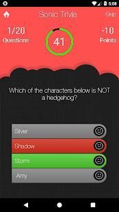 Trivia untuk Sonic the Hedgehog, karakter biru yang memiliki kemampuan untuk berlari pada kecepatan supersonik, adalah permainan kuis android gratis, menyenangkan dan adiktif, yang dibuat oleh Victory Quizzes untuk para penggemar, agar mereka dapat menguji pengetahuan mereka tentang kartun terkenal . Berada di pusat sorotan dengan mencapai tempat pertama dalam sistem peringkat kami sehingga setiap orang dapat melihat nama Anda! Apakah Anda memiliki waktu untuk menyelesaikan semua pertanyaan dengan benar?