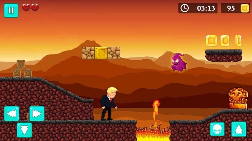 Find a special flower for the super firing, aim at your enemies and shoot them to survive in the trump world tour adventures. Save trump while running through hellfire volcano and dark cave tunnels.
