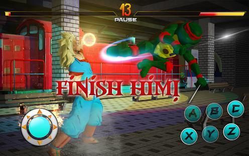 Welcome to the amazing street fighting championship. Do you love turtle ninja heroes then welcome to the showdown of mutants and superheroes? Fights among the ranks of legends and make your name among the most famed fighters of all time. Battle and keep up with the legacy of awesome players and define your strength performing amazing combos, grabs and surprise attacks. Download for awesome jaw-dropping street fight action.