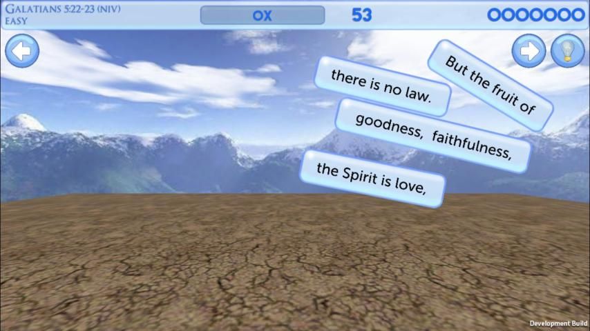 Verse Rain is a game that makes memorizing bible verses fun! Bible verse words rain from the sky and the player earn points as they tap the words in the correct order to reconstruct the verse. Words are read aloud as each word is tapped, reinforcing memorization both visually and audibly.