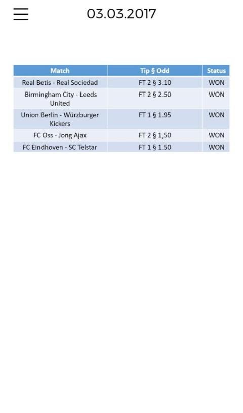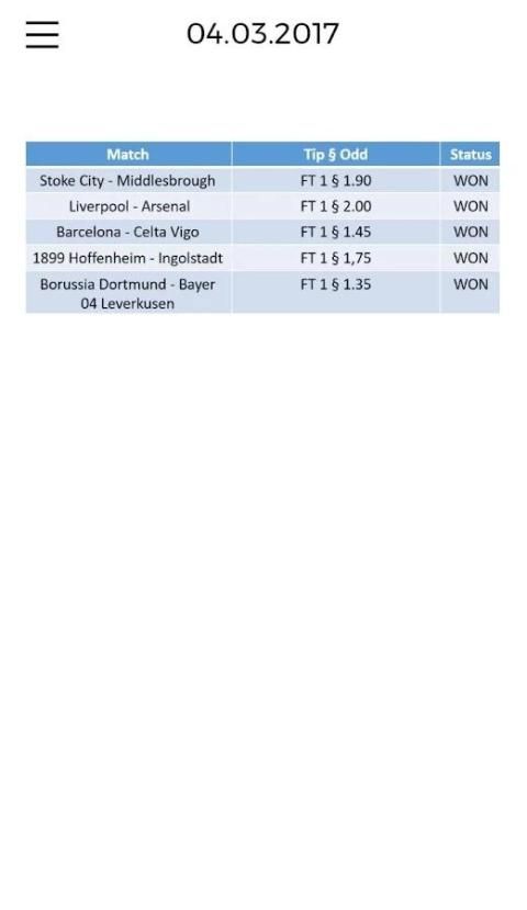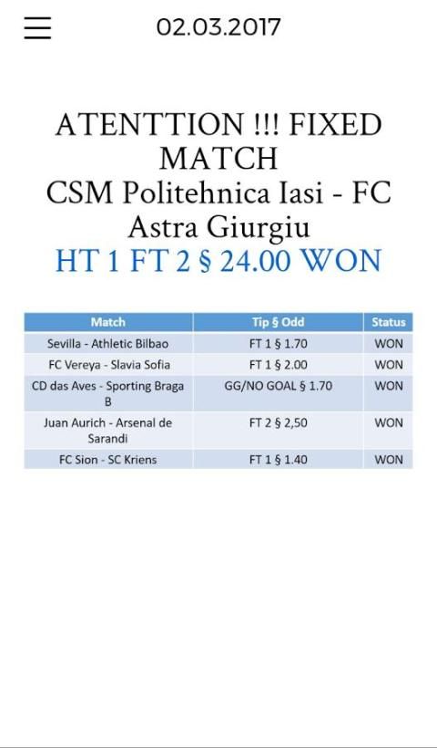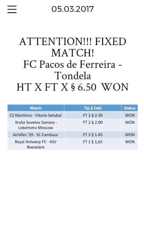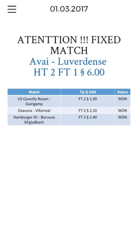 VIP Betting Tips dan Permainan Tetap adalah layanan online yang merangkum data yang sepak bola, tetap dan prediksi. Hal ini memungkinkan Anda untuk cepat mengakses data sepak bola penting. Selain menyediakan statistik yang relevan dan data, kami juga mengkhususkan diri dalam menyediakan HT tepat / FT (dimanipulasi), Correct Score (dimanipulasi), 1x2, Skor, Over / Under dan Kedua Tim untuk Skor tetap dan tips prediksi.