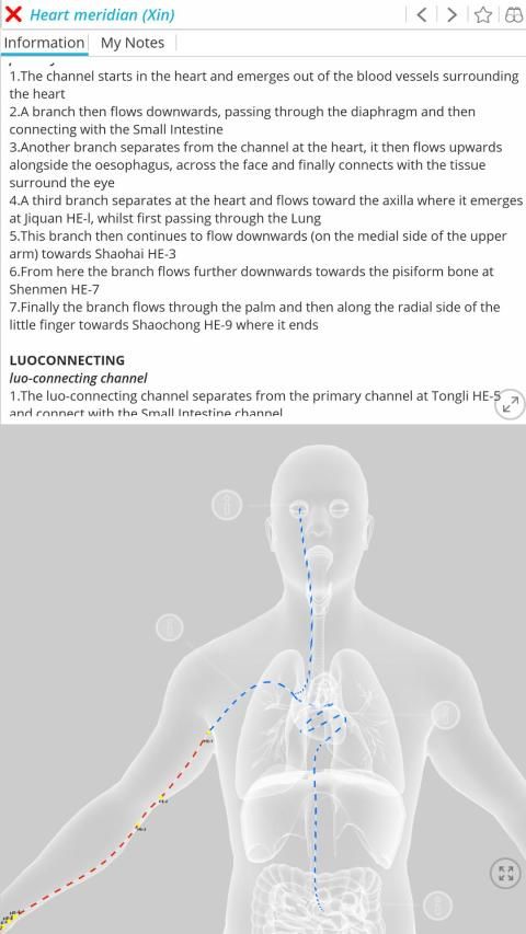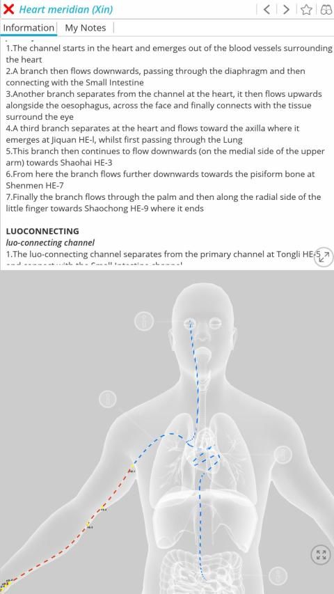 Setiap titik akupunktur, meridian (dan model anatomi) mengandung deskripsi tekstual lengkap, yang bisa