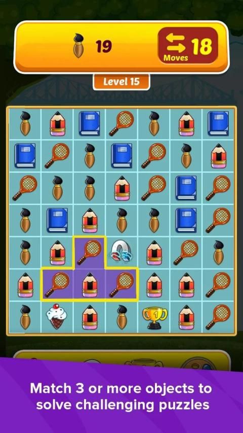 o gameplay Unik: membuat kombinasi pertandingan-3 dengan alat-alat tulis sekolah,