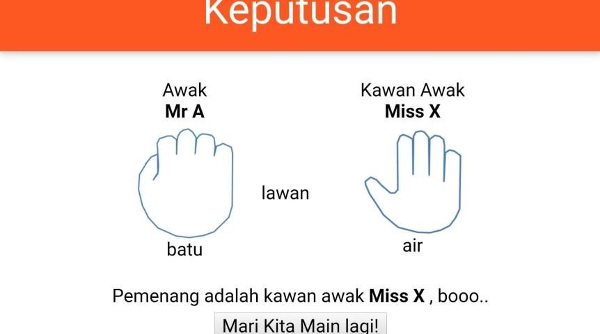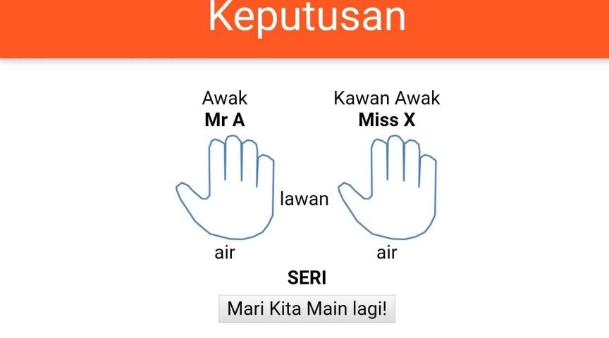 This games originated from Malaysian kids ways to determine who wins. Each player shows palm hand as a symbol of bird, water or rock. Bird will win against water but loss against rock. Water wins against water. A very popular and simple game when kids need to make decision among themselves.