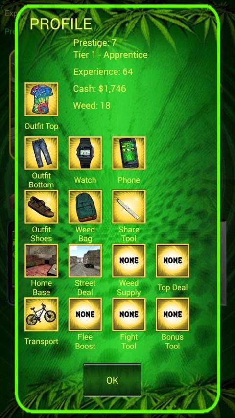 Mempertahankan merek Weed pertanian dengan menangani gulma Anda langsung ke pelanggan di jalan. Mulai kecil di The Hood tetapi bekerja dengan cara Anda menaiki tangga prestise dari Apprentice, Supplier, Pengatur lalu lintas, ke atas Dealer saat Anda meng-upgrade lemari pakaian Anda, perangkat pribadi, transportasi, home base, dan lainnya membuat penawaran yang lebih besar dan lebih baik sebagai pengalaman Anda tumbuh!