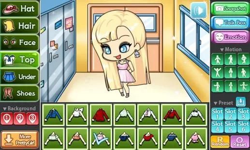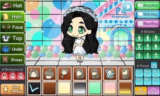 Anda dapat mengubah latar belakang, 9 pose dan gerakan, Anda juga dapat menyimpan Gadis Cantik Anda di 6 slot.