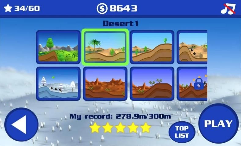 - Twelve levels in Mountain, Desert, Snow and Grand Canyon
