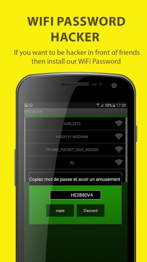 WiFi sandi hacker simulator adalah aplikasi prank yang memberikan kesan Anda bisa hack jaringan WiFi. App prank ini menciptakan ilusi bahwa hal itu dapat hack ke jaringan nirkabel dijamin dilindungi dengan WEP, AES atau enkripsi WPA2. Itu tidak benar-benar merugikan atau istirahat ke jaringan nirkabel. Tapi ini merupakan alat yang mengagumkan untuk mengesankan teman-teman Anda dan dengan mana Anda bisa bersenang-senang. ini membuat Anda terlihat seperti seorang hacker mahir dan jenius teknis. ini adalah lelucon yang sangat menyenangkan untuk bermain pada teman-teman Anda.