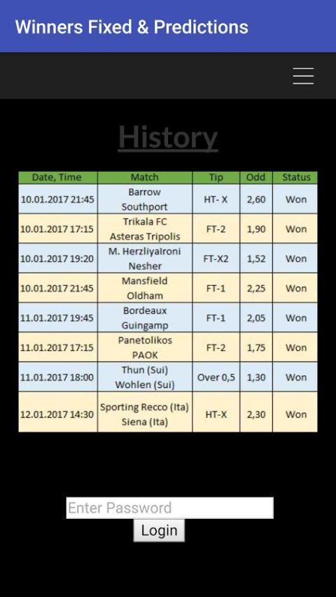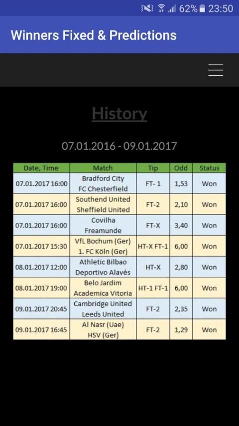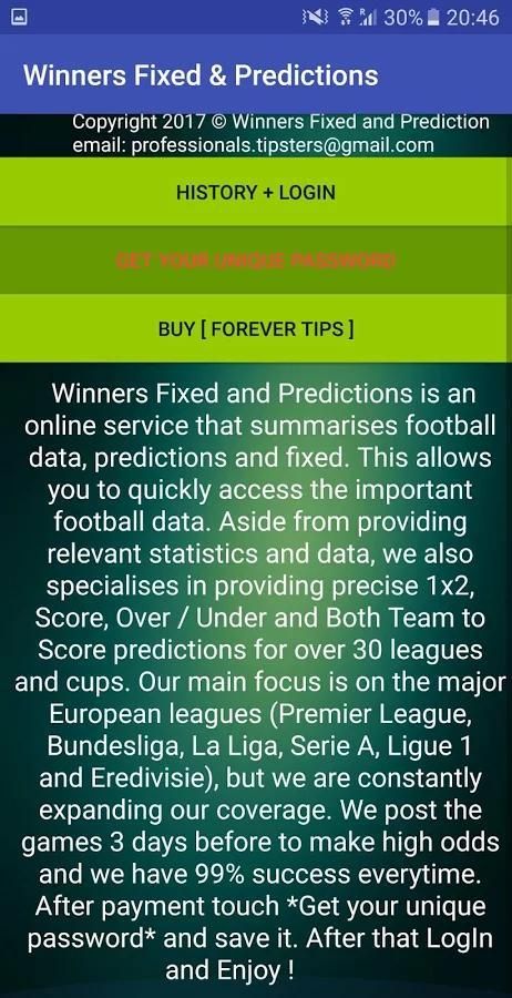 Pemenang Tetap dan Prediksi adalah layanan online yang merangkum data yang sepak bola, prediksi dan tetap. Hal ini memungkinkan Anda untuk cepat mengakses data sepak bola penting. Selain menyediakan statistik yang relevan dan data, kami juga mengkhususkan diri dalam menyediakan 1x2 tepat, Score, Over / Under dan Kedua Tim Skor prediksi selama lebih dari 30 liga dan cangkir. Fokus utama kami adalah pada liga utama Eropa (Premier League, Bundesliga, La Liga, Serie A, Ligue 1 dan Eredivisie), tapi kami terus memperluas cakupan kami. Kita posting game 3 hari sebelum membuat peluang yang baik dan kami memiliki 99% keberhasilan setiap. Anda harus membeli tips untuk melihatnya