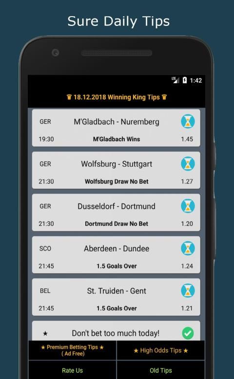 Dari para pengembang Winning Gang Betting Tips, Winning King Betting Tips memberikan para penggunanya kiat taruhan sepakbola terbaik dan prediksi akumulator harian dari tim yang berpengalaman. Tim taruhan kami menganalisis pertandingan sepak bola harian dan memberikan kiat-kiat taruhan sepakbola terbaik dan kiat peluang tinggi setiap hari. Kiat taruhan harian kami benar-benar aman dan pasti, cocok untuk petaruh yang aman. Tim analisis taruhan ahli kami memiliki tingkat keberhasilan yang sangat tinggi dan kami menyediakan layanan tip taruhan VIP tanpa biaya. Kami memberikan kiat taruhan sepakbola, bola basket, bola voli, dan prediksi taruhan tenis.