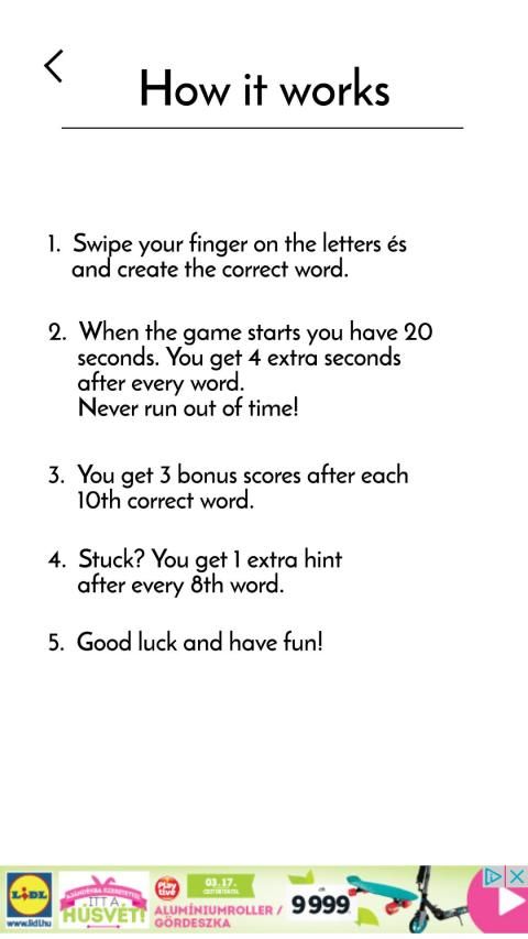 Time starts at 20 seconds and you can gain extra 4 seconds after every correct guess. 3 bonus scores are given after every 10th correct word and you get 1 bonus hint after every 8th - use them wisely!
