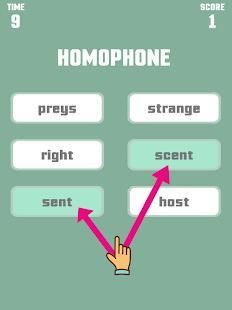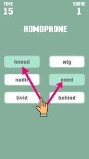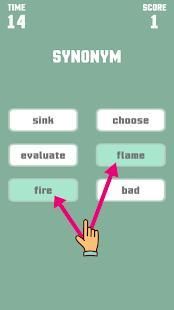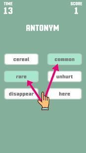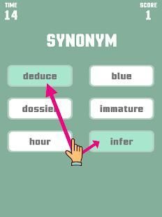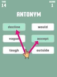 This game is a little puzzle and an addictive game that really challenges everyone from kids to adults to match words that have the relationship by antonym or synonym or homophone. For example: there are 6 given words divided into 2 columns ; your task is to choose 2 words for each column that has that relationship.