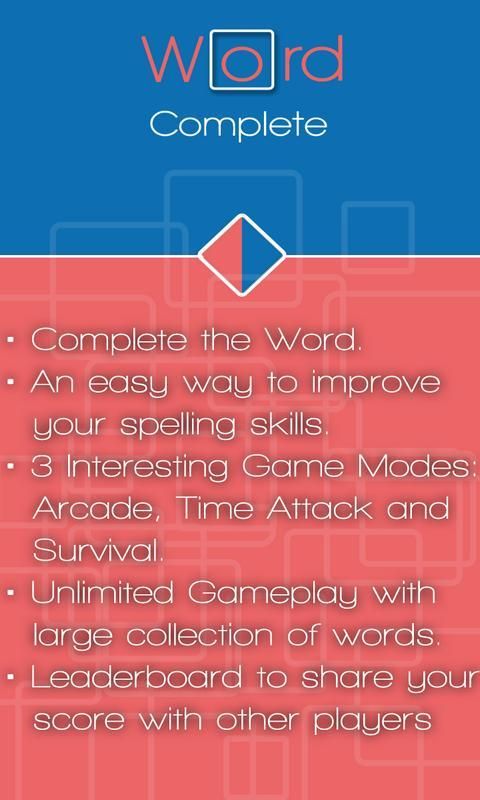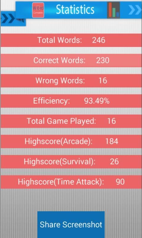 *** Arcade Mode - Ini adalah modus standar klasik di mana Anda akan diberikan sepuluh kata untuk menyelesaikan. Untuk setiap kata Anda memiliki maksimal 10 detik. Cobalah untuk menyelesaikan kata secepat mungkin untuk mendapatkan nilai yang lebih baik (Waktu kiri menambah skor Anda).